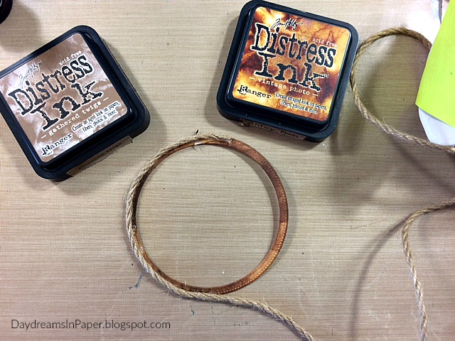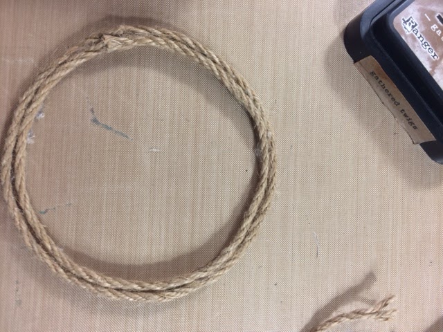 I use circle dies to create a “window” to the sea. I cut the circle out of Neenah Solar White 110 lb. card stock and ink it with Vintage Photo and Gathered Twigs Distress Inks to cover any white that may show through. I then take thick burlap cord and with a hot glue gun adhere it to the outside of the circle.