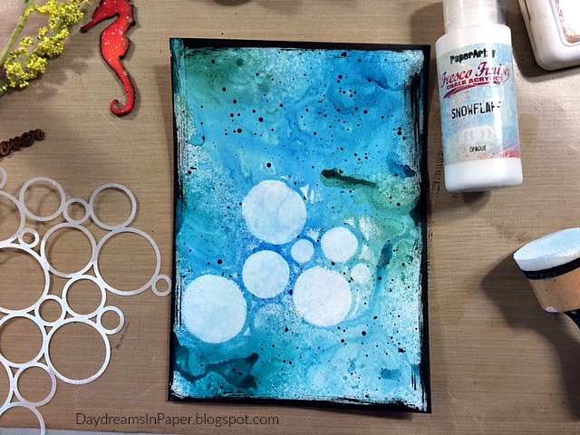 Create some white behind the focal point. Here, I use PaperArtsy Snowflake Fresco Finish paint with a mini ink blending tool and stencil on the Simon Says Stamp Ring Cluster stencil.