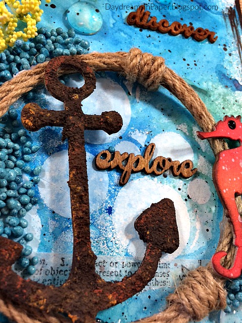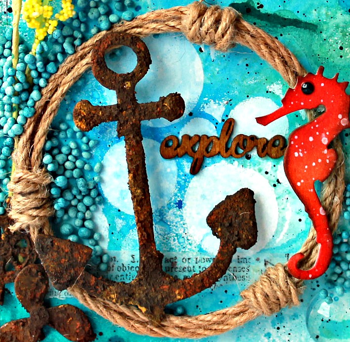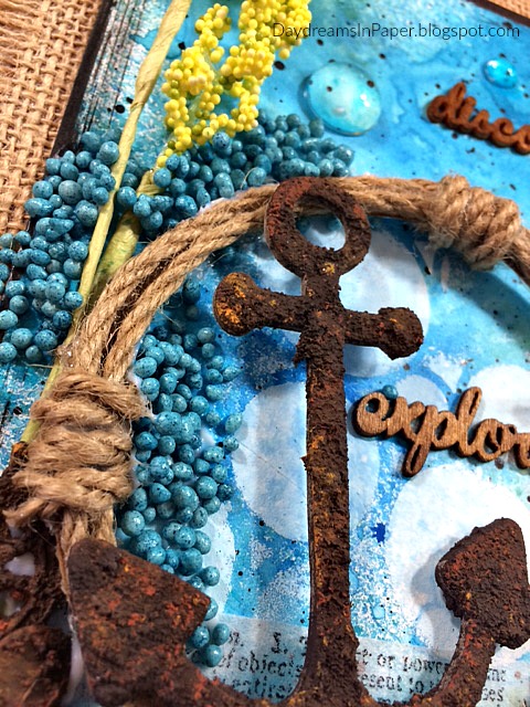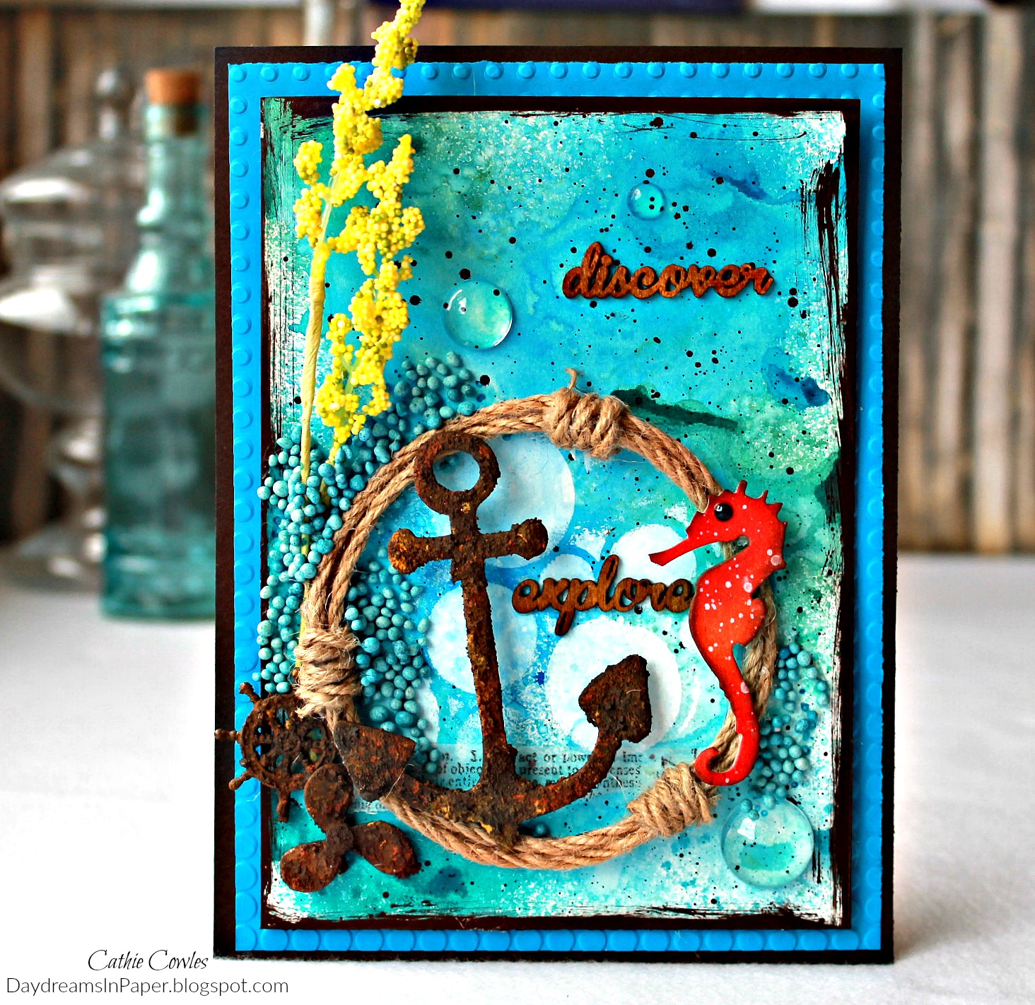 Hi Everyone! I’m so happy you stopped by for the Simon Says Stamp Monday Challenge. Our theme this week is, Nautical. I love everything about the sea and the first thing that came to my mind was a deep sea expedition where rusted treasures were found among the beautiful blue ocean water. I hope you enjoy seeing how I put together my mixed media panel below.