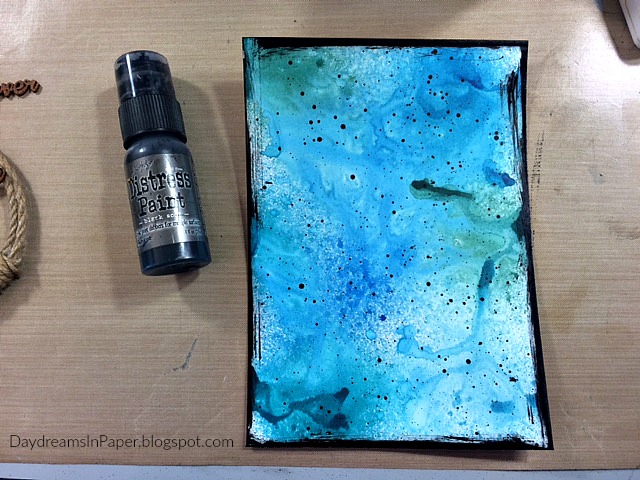 Cut a piece of Bristol Watercolor paper to 5″ x 7″ and spray it liberally with water. Next, spray on Salty Ocean, Broken China, Peacock Feathers, Tumbled Glass, Evergreen Bough and Mermaid Lagoon Distress Inks onto the paper in random areas. Dry the inks completely with a heat tool.