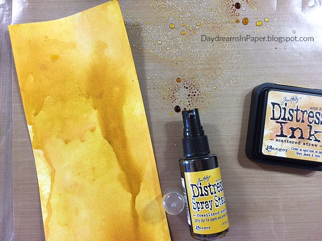 While the card panel is drying, prepare the watercolor paper for the flower. Spray Fossilized Amber  and smudge some Scattered Straw Distress Ink onto a craft mat and dilute with water. Run the piece of watercolor paper through the ink and spray solution. Dry with a heat tool.