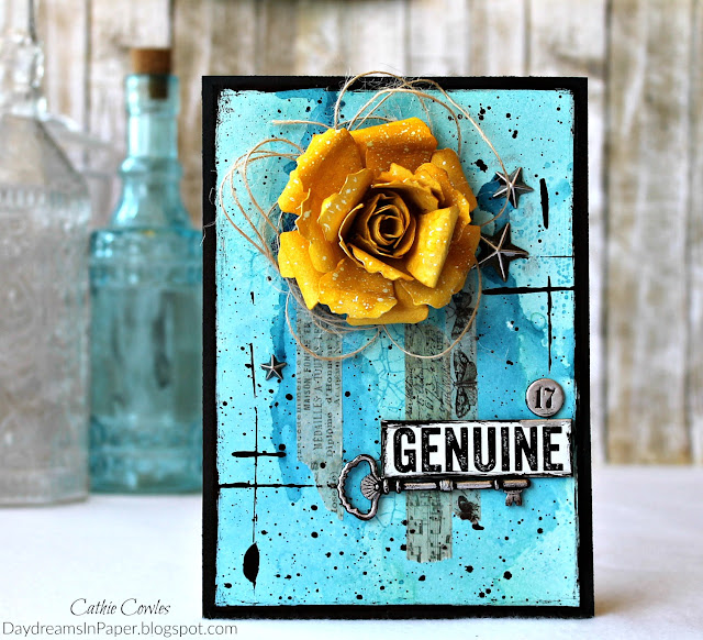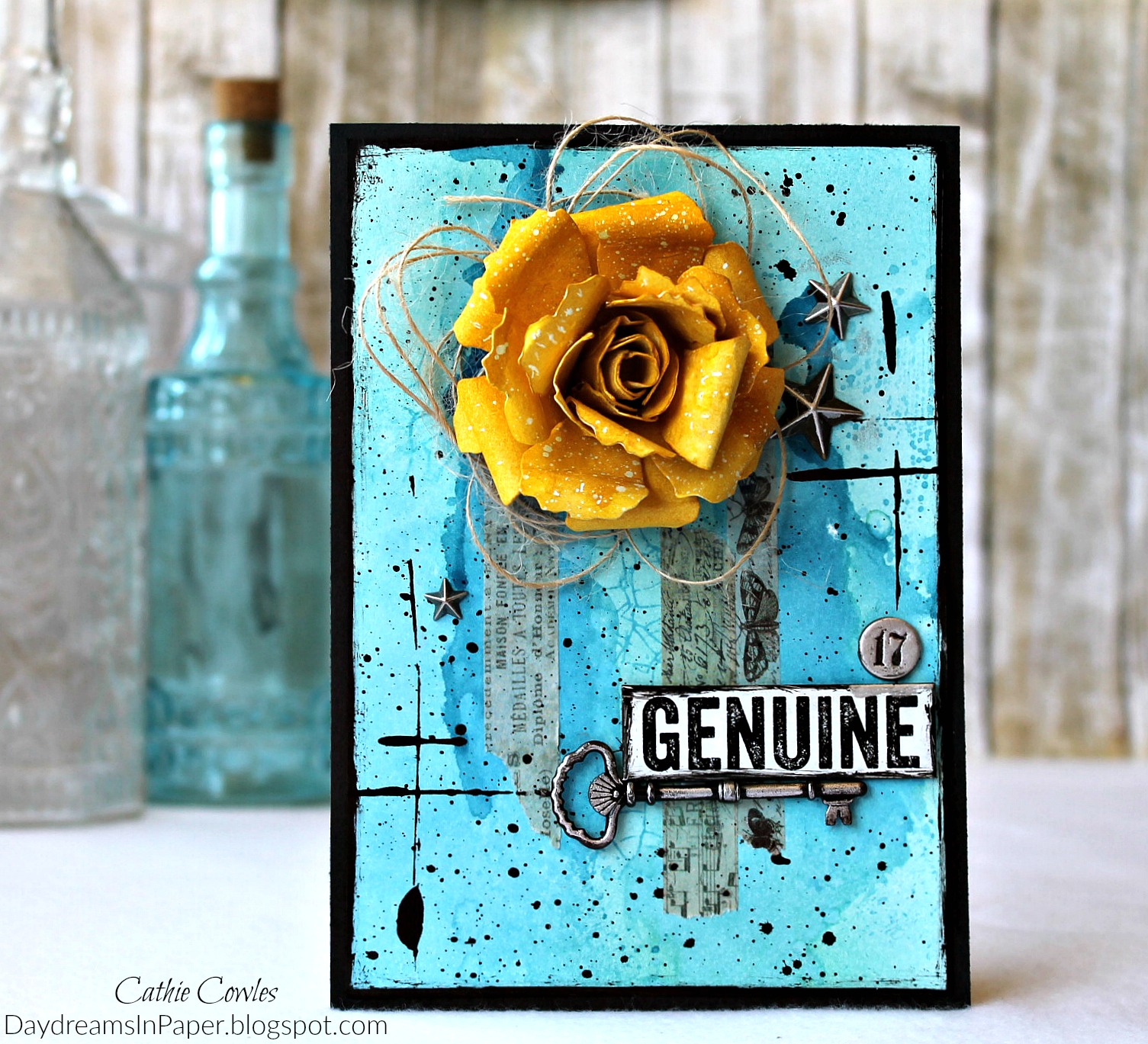 To finish the card, I add some Prima Metal Mini Stars, an ornate black key, and a Tim Holtz number brad that I colored with Prima Metallique Old Silver Wax. I add a Tim Holtz Quote Chip, the rose with some May Arts natural burlap twine behind it and attach the completed panel onto a 5″ x 7″ piece of Simon Says Stamp Black card stock.