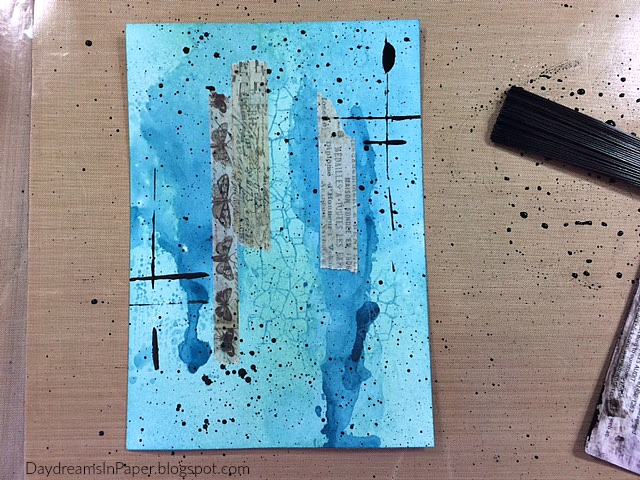 Next, apply some Black Soot Distress Paint and water onto a craft mat and mix with the Tim Holtz Splatter Brush. Using the brush, flick the diluted paint onto the card panel to create splatters. Dry the splatters with a heat tool. When the spatters are completely dry, run the edge of an old gift card through the paint and water mixture. Take the gift card with the painted edge and add lines in random areas on the card panel by gently touching the gift card to the paper. The background is finished and needs to completely dry.