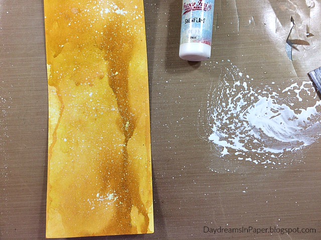 When the paper is completely dry, squeeze some PaperArtsy Snowflake Fresco Finish paint onto a craft mat and dilute with water. Using a splatter brush, mix the paint and water and flick splatters onto the yellow paper.