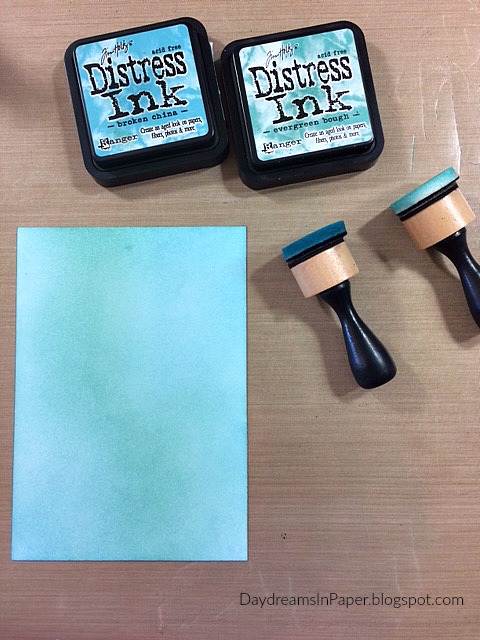 Begin with a 4-3/4″ x 6-3/4″ piece of Bristol watercolor paper and apply Broken China and Evergreen Bough Distress Ink with a mini ink blending tool.