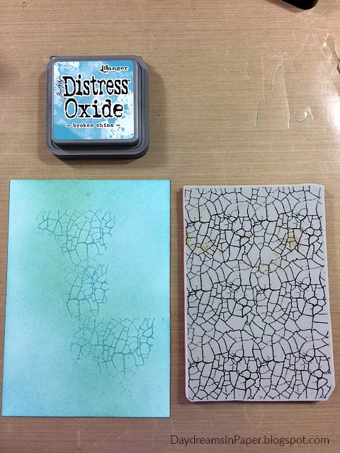 Stamp on the Tim Holtz Cracks background stamp to the center with Broken China Distress Oxide ink.