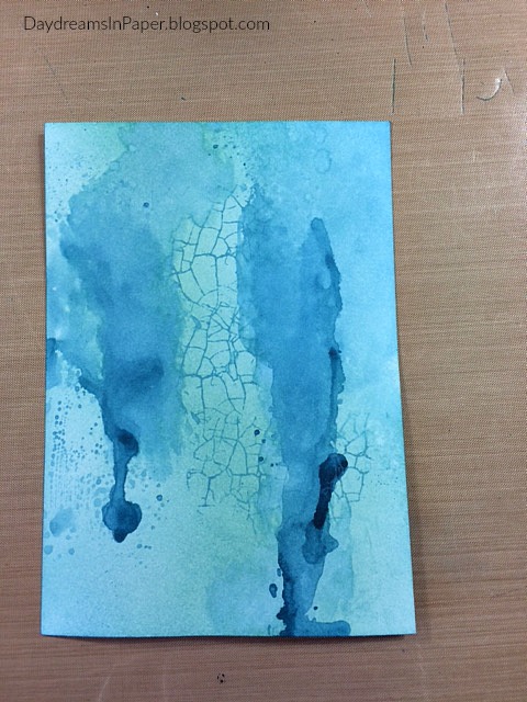 Spray Mermaid Lagoon Distress Spray and water onto a craft mat and mix together. Pick up the card panel and run it through the ink and water mixture.