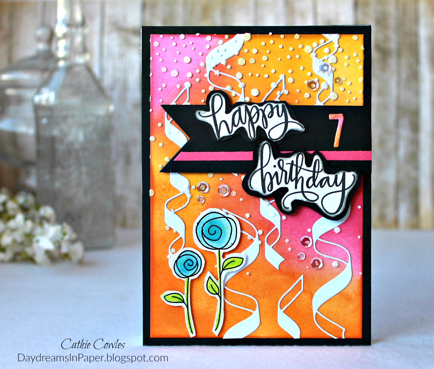 To finish the card, I created a banner using the Simon Says Stamp Basic Banner die set cut from Simon Says Stamp Black card stock. I adhered the banner to the panel in the top portion of the card. I added a thin strip of My Favorite Things Razzle Berry card stock to the bottom portion of the black banner. I then stamped “Happy Birthday” from the Simon Says Stamp Big Scripty Greetings in Simon Says Stamp Intense Black ink and cut out the words around the edges of the letters. I inked the edges with black ink and adhered them to a piece of Simon Says Stamp Black card stock cutting around the sentiment to leave a small black border. I adhered the number 7 from the Tim Holtz Alphanumeric die set inked with the same colors as I used in my background. I adhered the flowers in the bottom left corner with 3d foam tape and some clear sequins for sparkle and my card is done.