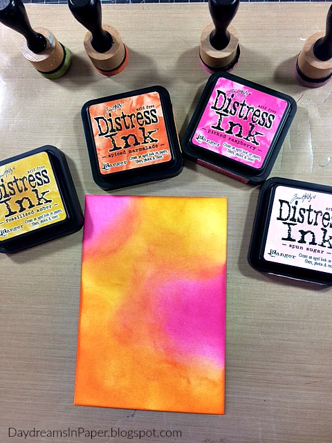 I started with a 4-3/4″ x 6-3/4″ piece of Bristol Watercolor Paper and applied Fossilized Amber, Spiced Marmalade, Picked Raspberry and Spun Sugar in random areas on the paper using a mini ink blending tool.