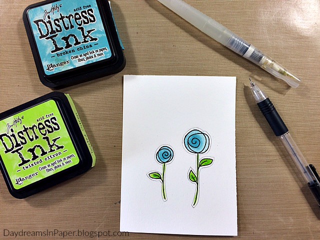 To create the flowers, I stamped two flowers onto a small piece of Bristol watercolor paper with Versamark Embossing Ink and sprinkled on some Ranger black embossing powder. I heat that with a heat tool. I then colored the flowers with Broken China and Twisted Citron Distress Inks. I outlined the flowers with a pencil so I had a line to follow when cutting them out.