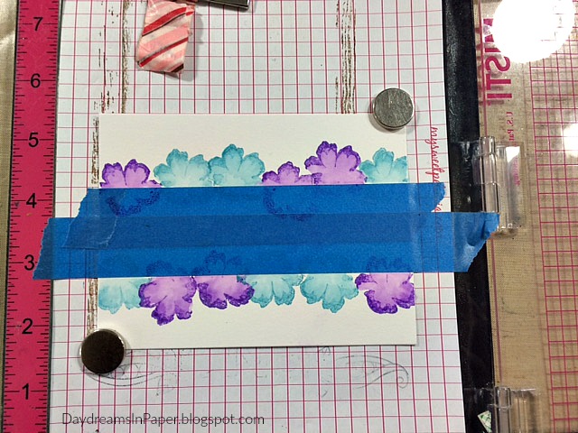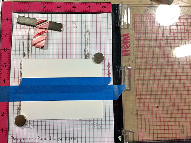 I cut a 3-7/8″ x 5-1/8″ piece of Neenah Solar White 110 card stock and used lightly sticky tape to create a mask in the center of the card.