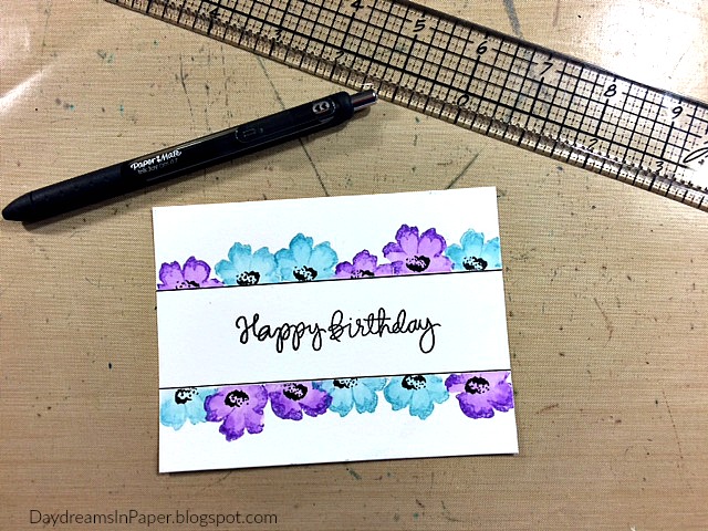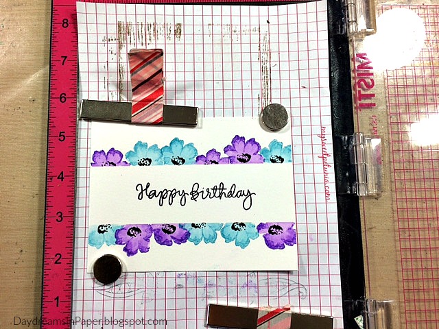 I gently peel away the masking tape and stamp Happy Birthday in the middle using the Simon Says Stamp Handwritten Sentiments.