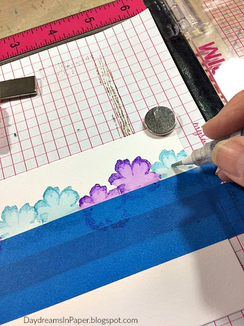 I stamp on the outer layer of the single flower that comes in the Sending Flowers stamp set with Wilted Violet and Broken China Distress Ink and pull the color to the center of the flower using a waterbrush.