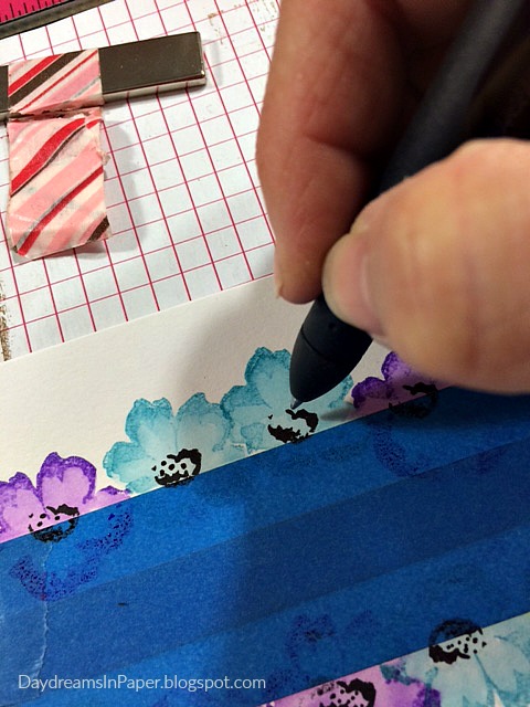 To give the card a finished look, I add a thin black border with the black gel pen and the Tim Holtz Design Ruler.