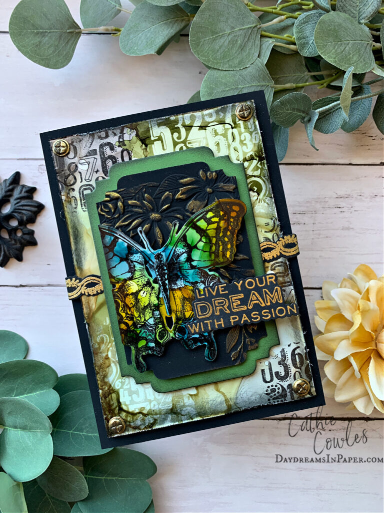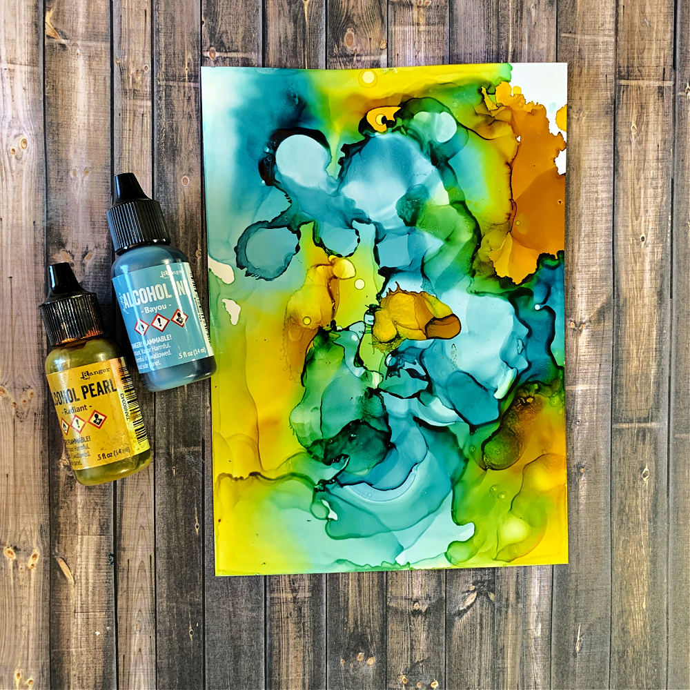 Create a colorful background out of any colors and type of ink you desire. I used Ranger Bayou and Radiant Pearl alcohol inks.