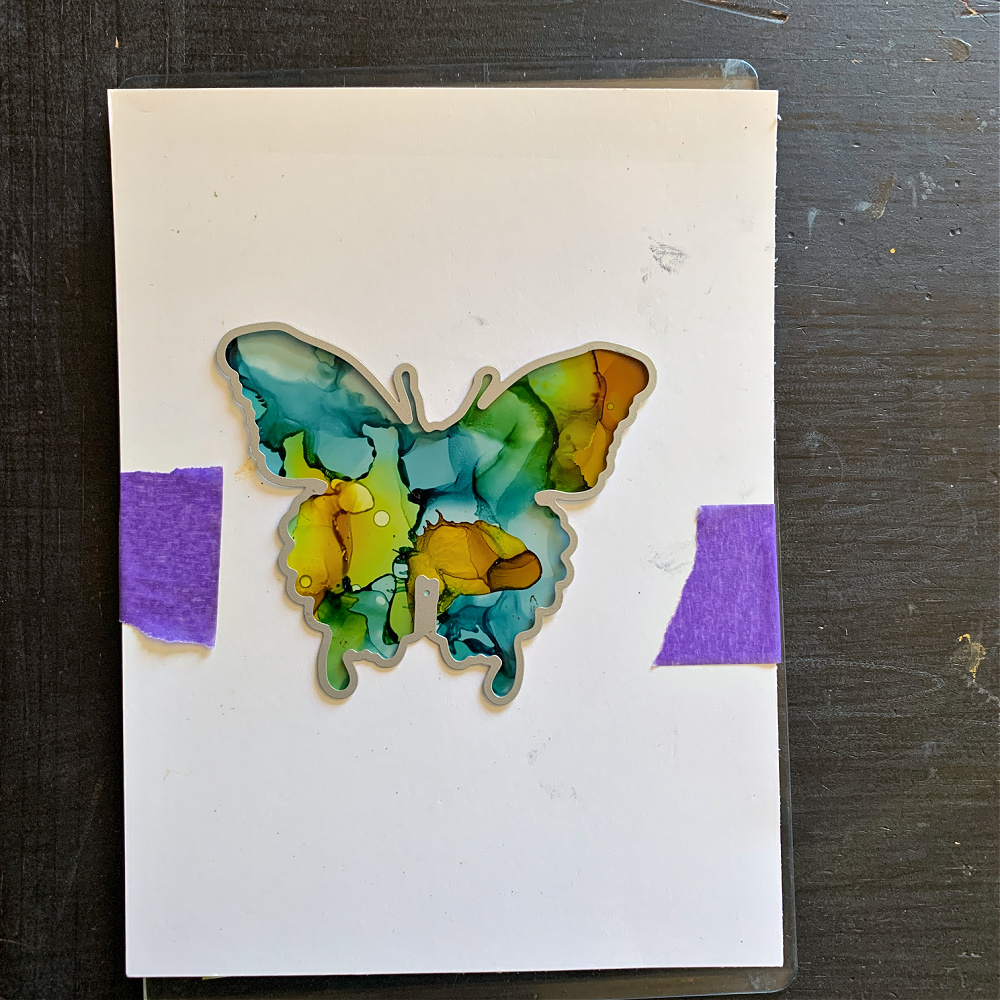 Once you are happy with the colors in the placement of the window, tape the two pieces of cardstock together. Fit the butterfly die inside the cut out window. You should feel it fall into place. Once it falls into place you can secure it with a piece of tape, if needed.