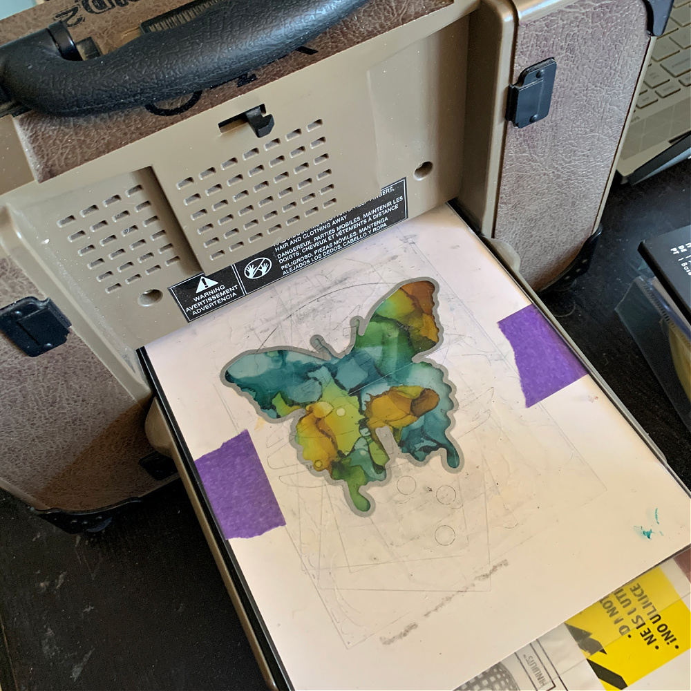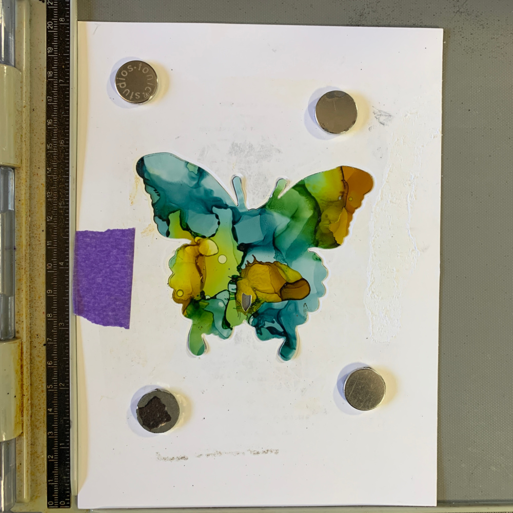 Take the butterfly cut out cardstock piece from Step 1 and place it on a stamping tool. Secure it with magnets. Insert the cut out inked butterfly from Step 6 and place it into the cut out butterfly area as shown above. You will need to secure this cut out piece by using double sided tape underneath the butterfly or by using a small piece of a Sizzix Sticky Grid sheet.