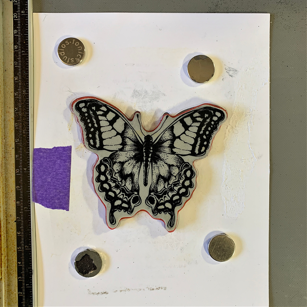 Fit the butterfly stamp into the cut out area. You should feel it fall or slide into place. If you give it a little nudge, it shouldn’t move. When this happens you know you have the stamp lined up with the cut out area correctly and it’s safe to stamp your image.