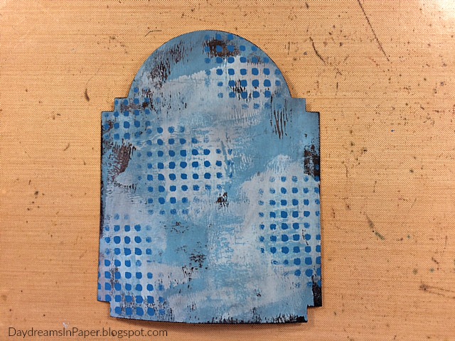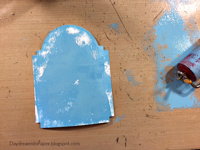 I cut the background piece for the panel from the Tim Holtz Vintage Cabinet Card and using a brayer, I roll on some Paper Artsy Smurf Fresco Finish Paint. When using the brayer, be sure to roll and lift, do use a back and forth motion. Be sure to leave some areas uncovered. Allow that layer to completely dry.