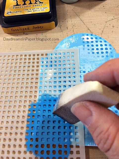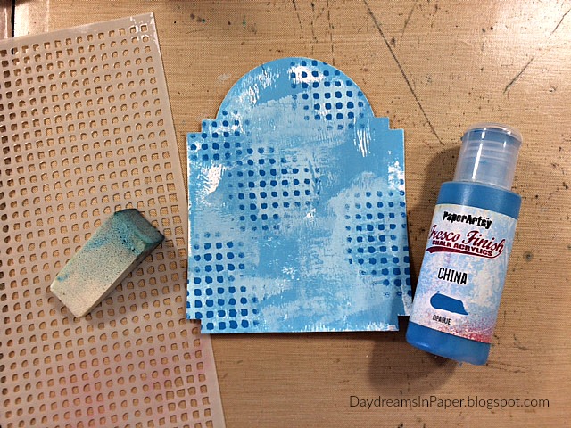 Next, I add some stenciling with the Dina Wakley Plastic Canvas stencil and apply that on my background with Paper Artsy China Fresco Finish Paint. I use a small sponge and a dabbing motion to apply the pattern. You do not need much paint at all, so make sure you don’t put too much paint on the sponge or it will ooze underneath the stencil creating a blurry image.