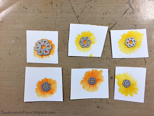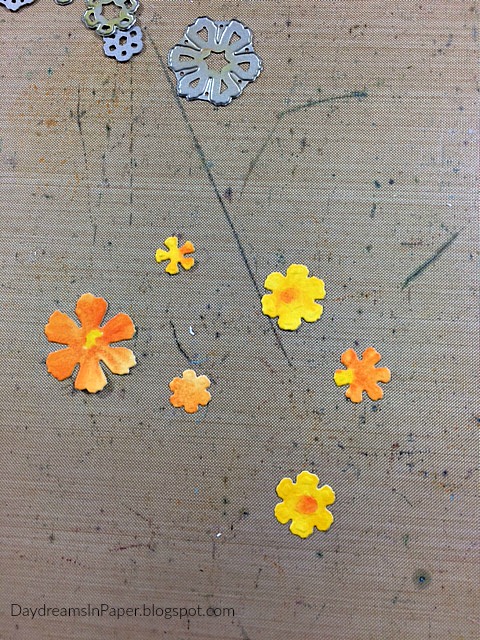 I use the Tim Holtz Small Tattered Florals die set and cut out each piece as shown above on a die cutting machine.