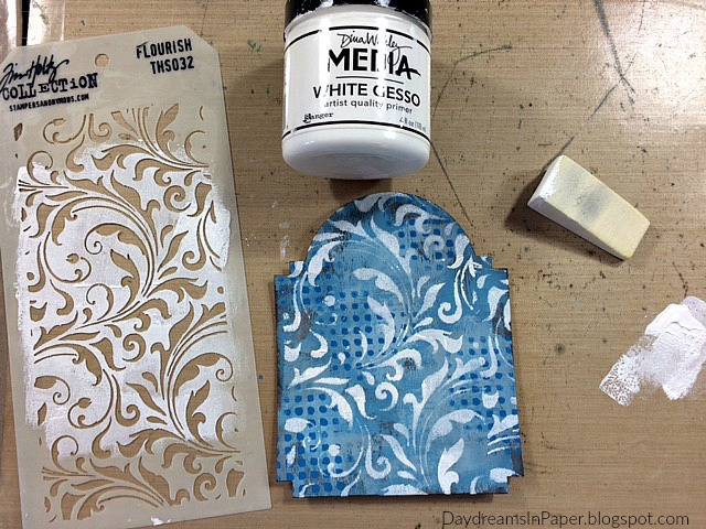 Next, I stencil on the Tim Holtz Flourish Layering Stencil with Dina Wakley White Gesso.