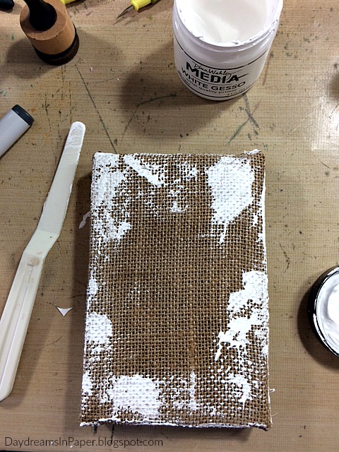 I keep the burlap panel simple by adding some Dina Wakley White Gesso in random areas on the top and sides of the burlap and allow that to completely dry.