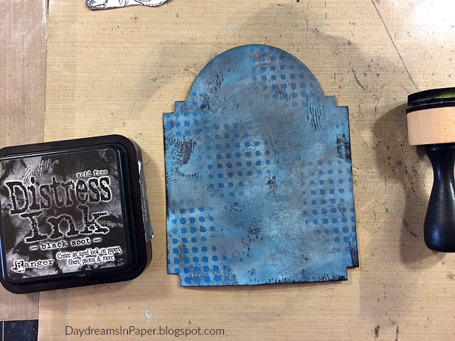 Next, I completely cover the background with Black Soot Distress Ink using a mini ink blending tool. I allow that to sit on top of the background for a few seconds and then wipe all the black ink off with a baby wipe.