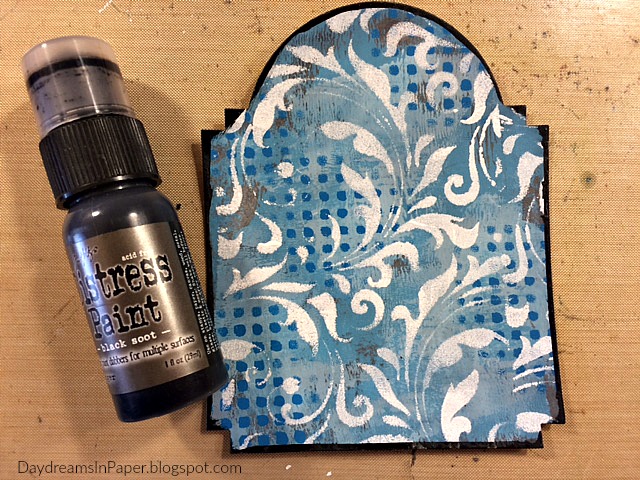To complete the background piece, I use Black Soot Distress Paint with a dauber top and run it along the edges.