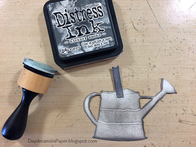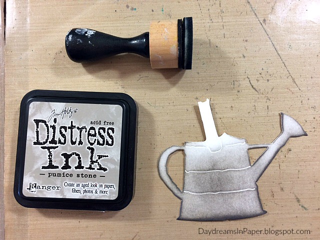 First, I created the watering can for my project using the Tim Holtz Watering Can die set. I colored the can with Pumice Stone Distress Ink using a mini ink blending tool as shown above.