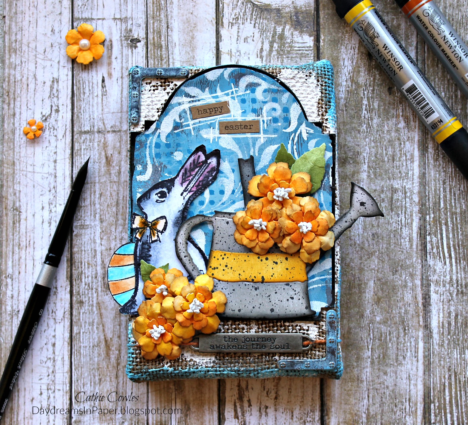 To complete the panel, I dabb on some Broken China Distress Paint along the edges of the burlap panel and adhere the background piece onto that. I create the bunny from the Tim Holtz Bunny Sketch stamp which I color with Derwent Inktense watercolor pencils and fussy cut the bunny out of the sketch. I add an Easter egg from the Simon Says Stamp Some Bunny stamp set colored with Winsor & Newton watercolor markers. I adhere the watering can to the panel and a Tim Holtz Word Band with twine to the bottom. I then add the flowers I created and the “happy easter” sentiment from the Tim Holtz Seasonal Chit Chat stickers. I added some lines for interest around the top sentiment with a Signo Uniball White gel pen. I also add some metal pieces colored with Black Soot and Broken China Distress Paint to the top left and bottom right of the panel,