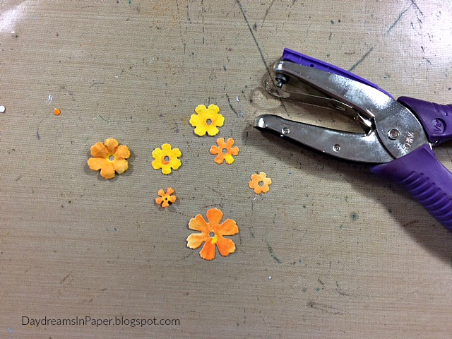 I punch a 1/8″ hole in the center of the petals with a hole puncher so I can build the flowers around some stamen stems.