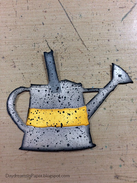The die set comes with a separate center piece for the middle area of the watering can. I chose to color this piece with Fossilized Amber Distress Ink and adhere that to the center of the watering can. I then ink all the edges with Black Soot Distress Ink and splattered Black Soot Distress Paint onto the can using the Tim Holtz Splatter brush.