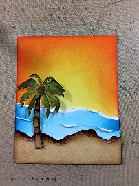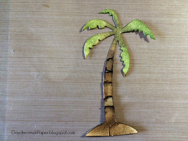 I added three little coconuts to the palm tree and cut off the base of the palm tree before adhering it to the beach scene.