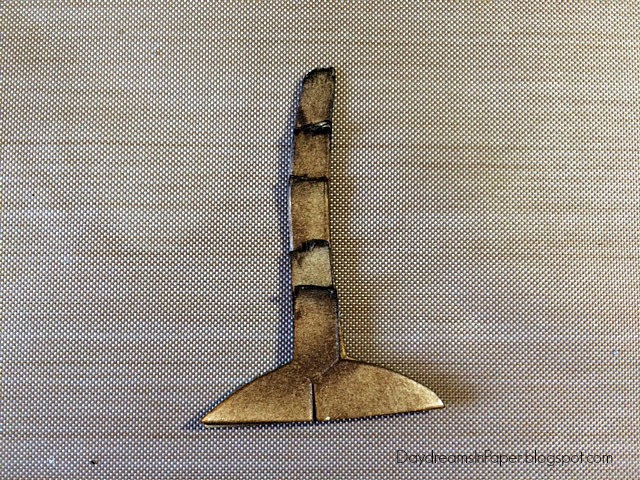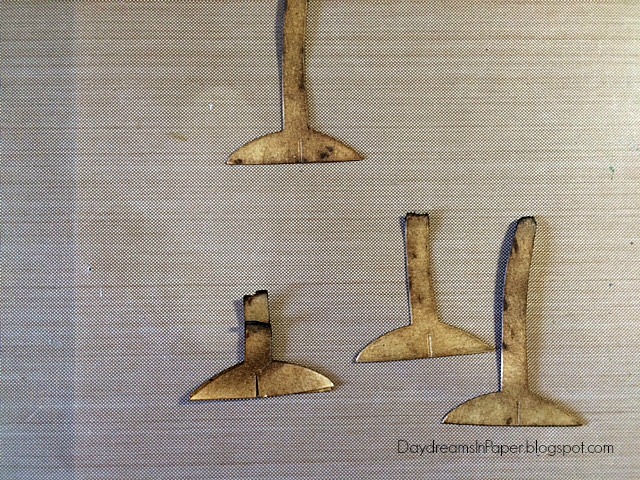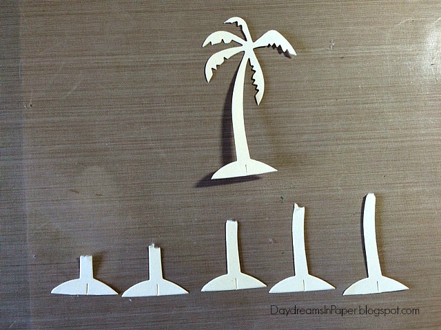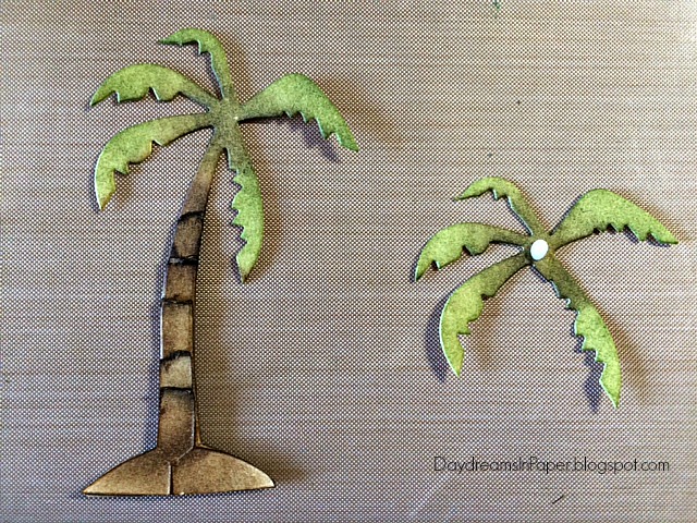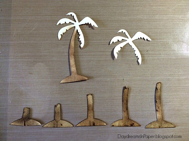 I live in Arizona and am surrounded by palm trees. I wanted mine to have dimension and character so I came up with a way to make them look a little more realistic. To do this, cut out six of the palm trees from the Tim Holtz Village Surf Shack die set.
