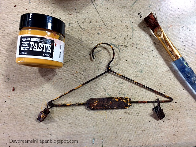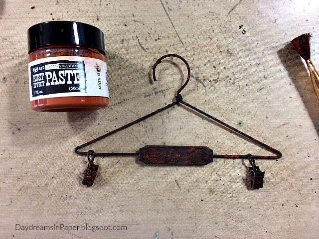 To rust the Tim Holtz Hanger, I use Prima Rust Effect Pastes. First, I dab on some brown rust all over the hanger and clips. There is no need to allow the first layer to dry before moving onto the next layer and there is no need to clean the brush between layers.