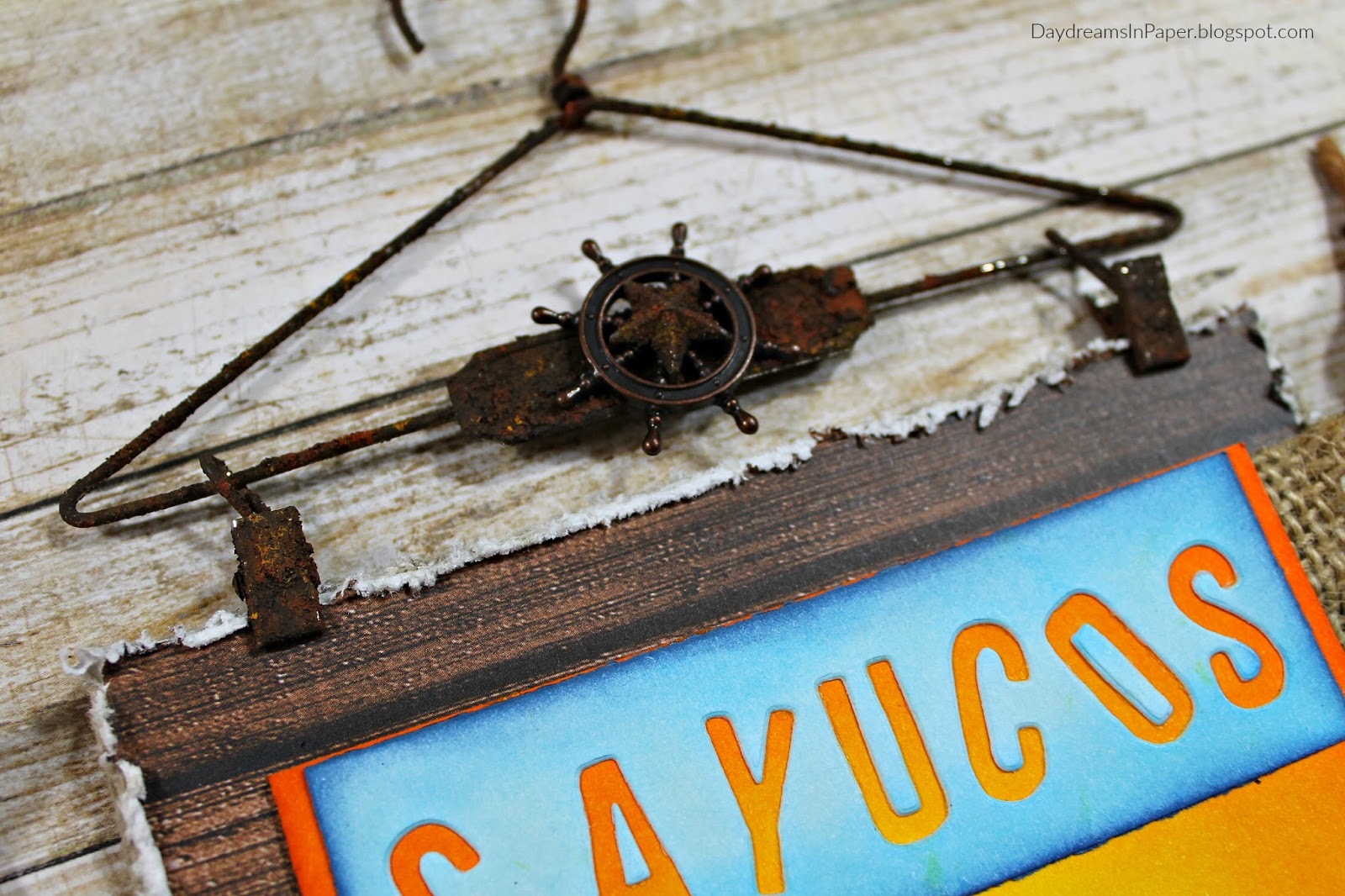 To complete the wall hanging, I add a surfboard from the Tim Holtz Surf Shack die set and a small gathered and tied burlap piece with some seashells at the base of the palm tree. I cut a strip of Neenah Desert Storm card stock and write the latitude and longitude of Cayucos on the strip with a black marker and ink the edges with Gathered Twigs Distress Ink. I cut the abbreviation letters for California from the same alphanumeric die set and adhere them to the bottom left corner. A small piece of gathered burlap is placed behind the top right corner of the beach scene. I clip the rusted hanger onto the wooded chipboard piece and add a small ship’s wheel and rusted Tim Holtz Star to the center and my wall hanging is done.