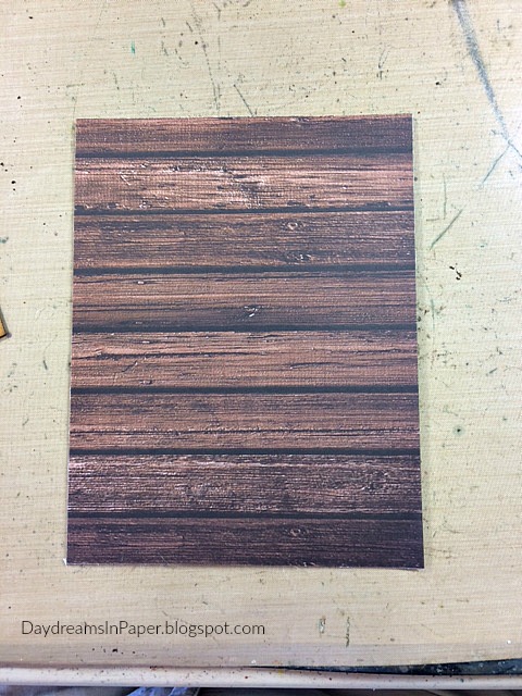 The wood background is very simple. I cut a 5-3/4″ x 7-1/2″ piece of chipboard and cover it with the dark wood card stock from the Simple Stories Sn@p paper pack. I distress the edges with the Prima Distressing Tool. (Photo of distressed edges not shown but you can see the distressed edges on the finished project.)