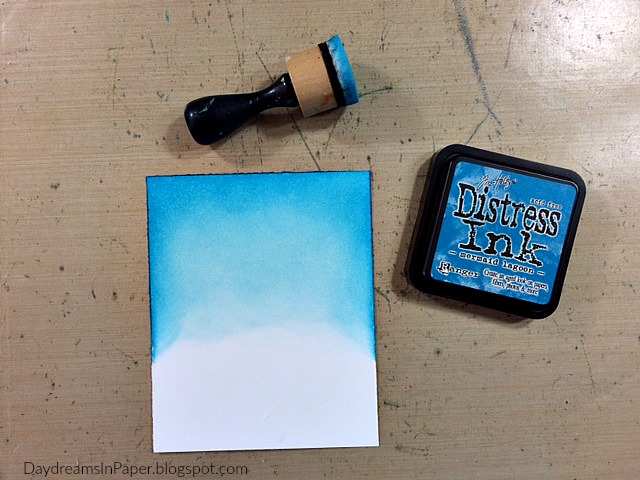 For the ocean, I take another 4-1/2″ x 5-1/2″ piece of Neenah Solar White card stock and ink the edges on the top half of the piece with Tumbled Glass Distress Ink.