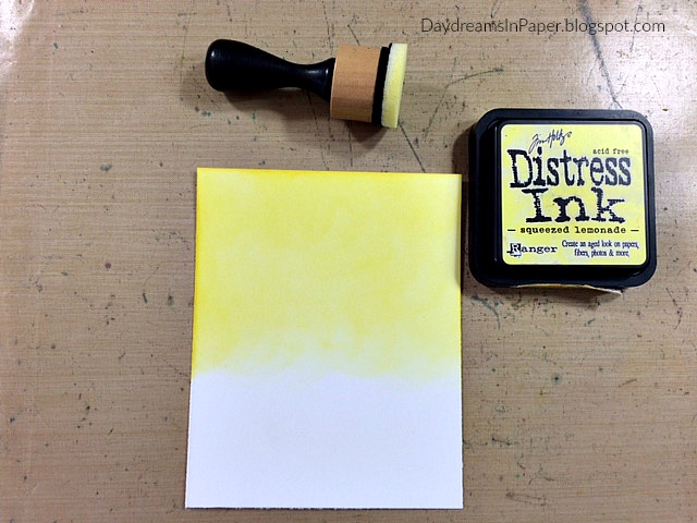 I begin by creating the background scene for my wall hanging by inking the top half of a 4-1/2″ x 5-1/2″ piece of Neenah Solar White card stock with Squeezed Lemonade Distress Ink.