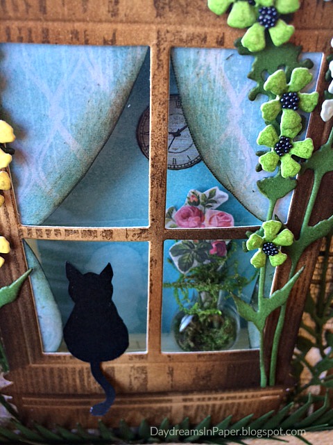 I made the window into a little shadow box by propping the window pane onto 3d foam tape. I create a “window” with Judkins Window Plastic by cutting the plastic the same size as the window and adhere all the layers together to create the shadow box. The layers are as follows from the top down: window pane, window plastic, curtain, 3d foam tape and blue background piece. Inside the window there is a Tim Holtz Tiny Vial with moss stuffed inside and a rose ephemera piece from the Tim Holtz Snippets Ephemera Paperie pieces. I adhered a small ephemera clock to the wall on the inside and a cute little silhouette of a cat looking inside the window on the outside of the window so his cute little tail can hang down.