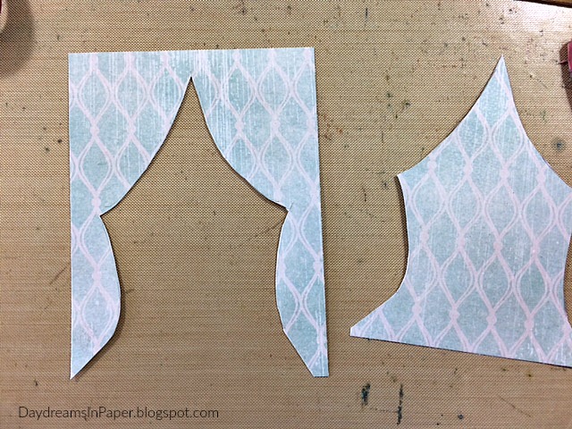 Placing the patterned piece of card stock behind the window, I draw the shape of the curtains with a pencil.