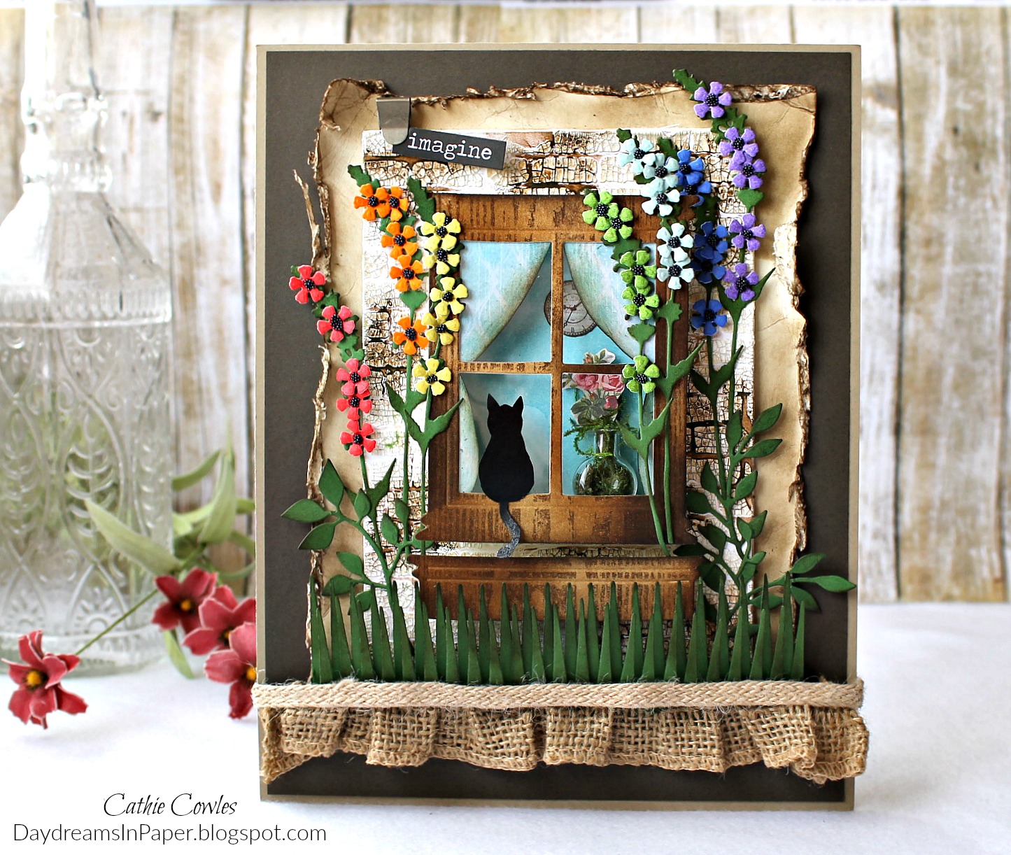To complete the panel, I adhered each element as shown above to a 6″ x 8″ piece of Bazzill Butter Mints card stock that has been distressed with a Prima Distressing Tool and inked with Ground Espresso Distress Ink. I create some cut grass from the Tim Holtz Tapered Fringe Decorative Strip. I cut two strips from Bazzill Lime Crush card stock and ink the edges with Forest Moss Distress Ink. I offset the strips, one from the other, and adhered them to the bottom of the distressed panel. I adhere that panel to a 7″ x 9″ piece of Bazzill Malt Ball card stock and underneath that is a 7-1/4″ x 9-1/4″ piece of Bazzill Walnut Cream card stock. I add a strip of gathered burlap ribbon underneath the grass. On the top corner I add a Tim Holtz Index Clip Fastener with the word “imagine” from the Big Chat sticker set to complete my project.