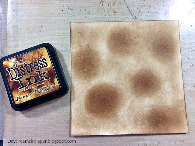 Next, I create some splotches or circles of Vintage Photo Distress Ink on the card stock with a mini ink blending tool.
