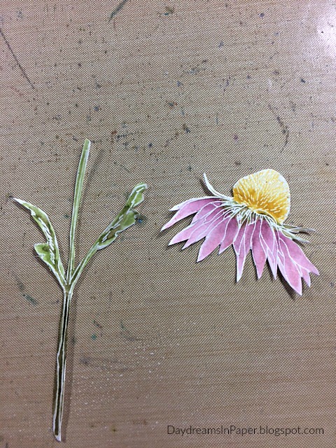After coloring the flower and stem, I fussy cut them out with a Tim Holtz Snips scissors. I create another flower for the project while my background is drying.