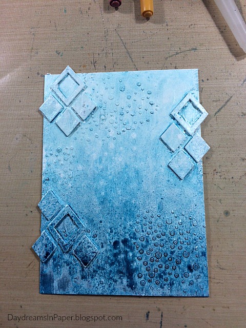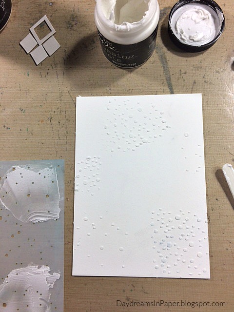 Before adhering the lattice pieces, I decide to stencil on the Simon Says Stamp Falling Snow stencil to the background in random areas and let that completely dry.