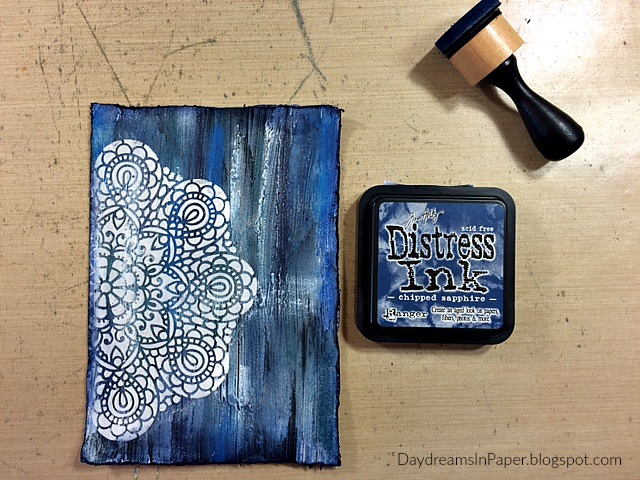 Now that the texture paste is completely dry, I add color using Faded Jeans, Salty Ocean, Chipped Sapphire and Stormy Sky Distress Crayons. I color the pigment on in random areas over the textured areas in small patches.
