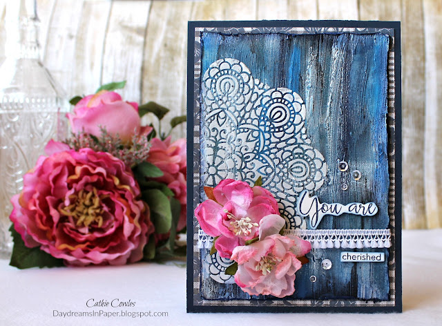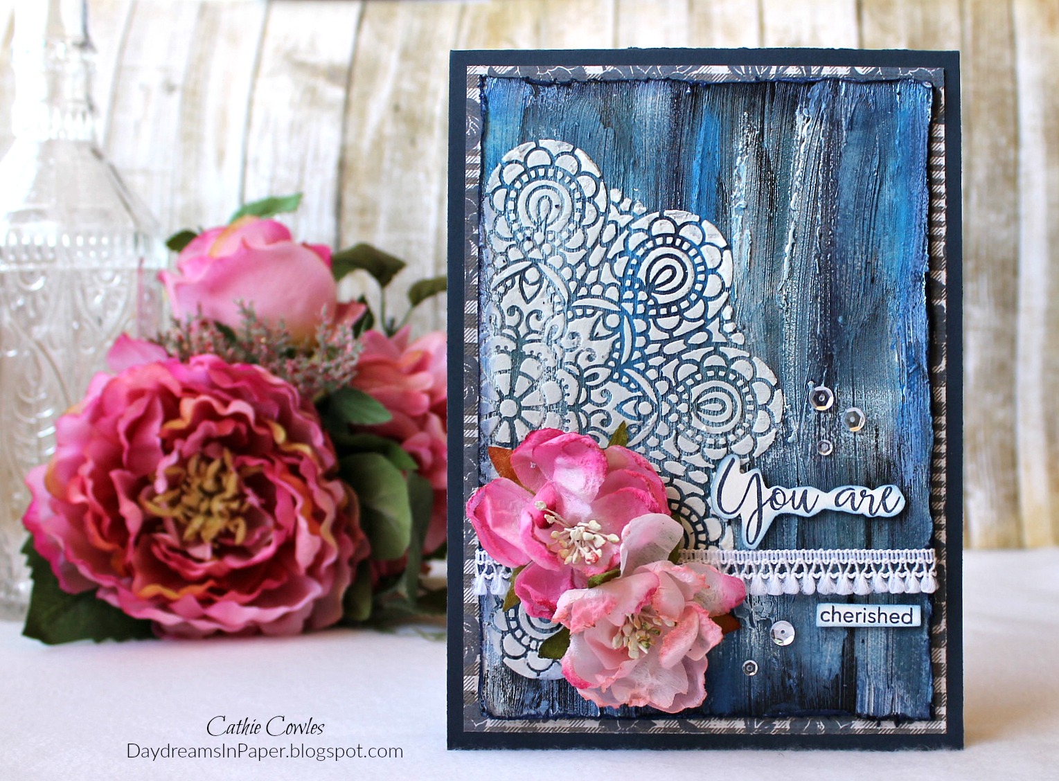 To finish the card, I add some Petaloo flowers and some pretty ribbon from my stash. I ink the “You are cherished” sentiment from the Simon Says Stamp Thoughtful Messages stamp set in Chipped Sapphire Distress Ink using the Misti tool and when the ink is dry I cut out the sentiment following the lines of the words. I ink the edges of the sentiments with Faded Jeans Distress Ink. I adhere the top panel to a 5″ x 7″ piece of card stock from the Tim Holtz Dapper paper stash and adhere that to a 5-1/2″ x 7-1/2″ piece of Blueberry Sour Bazzill card stock. I add a few crystal sequins and my card is done.