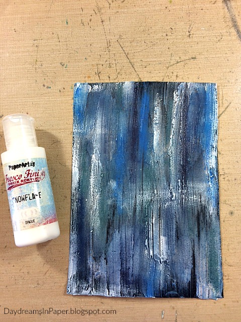 Now that the Distress Crayon pigments are completely dry, I add some white on the panel with my fingertips. I apply Paper Artsy Snowflake Fresco Finish paint over the areas that have the most raised texture. I allow the paint to completely dry before moving on to the next step.