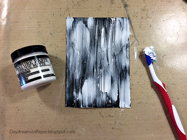 When the gesso is completely dry, I add Ranger Texture Paste with a toothbrush using downward strokes. I apply thicker layers in some areas and thinner layers in others. The process is totally random, just have fun creating texture with the paste. I allow that texture paste to completely dry.